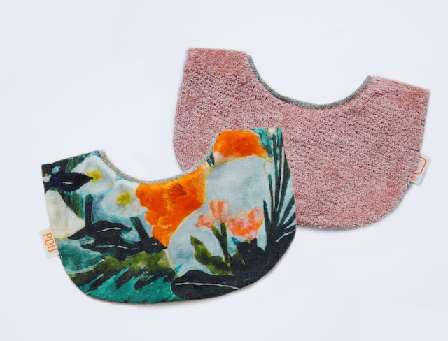 4wayのベビースタイ POUオリジナルテキスタイルのダブルガーゼ生地と 無地のタオル生地とのリバーシブル。 綿100%のふわふわ、やわらかな肌ざわりです。 スナップボタンで着脱もらくちん。 首回りは約30cmです◎ その日のコーディネートや気分に合わせて、柄を表にしたり無地を表にしたり ちょっとフォーマルな日には、くるりと前後を逆にしてつけ襟のように使っても◎ 後ろ姿もセーラーのようで素敵です。 《hole》 散歩していたらざざっと風が吹いて 急にぐるっと草花に囲まれるような 自分が小さくなって原っぱに吸い込まれるような感覚を オイルパステルと透明水彩で描いたデザイン 子どもと過ごす日々の中で ただ歩くだけの時間やただぼーっとするしかない時間があります そんな時に手を繋いだ先を見ると 真剣に何か考えているような何も考えていないような きれいなさらさらのほっぺたと長いまつ毛が見えて 何も目的のない何もない時間の尊さを思い知るような気がします 日常に埋もれてすっかり忘れていたものもを覗き込むような気持ちをこめて hole(穴)とタイトルをつけました ※名入れ刺繍可能商品です。 タオル生地の面に刺繍をお入れいたします。 オプションよりご記入・糸色の選択をお願いいたします。