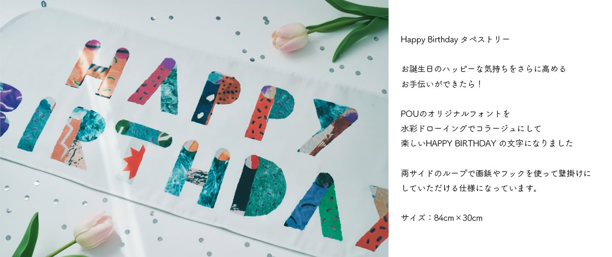 お誕生日のハッピーな気持ちを高める お手伝いができたら!と思って作った Happy Birthday タペストリーです お誕生日会のデコレーションや お誕生日の記念撮影の背景などに ぜひ使っていただきたいアイテムです! POUのオリジナルフォントをベースに 水彩ドローイングをコラージュすることで さらに楽しいHAPPY BIRTHDAYの文字になりました。 両サイドのループで画鋲やフックで 壁掛けにできる仕様になっています◎ 2枚仕立てなのでしっかりと張り感があります。 綿なので折りじわもアイロンで簡単に取れます◎ サイズ:約30cm×83cm