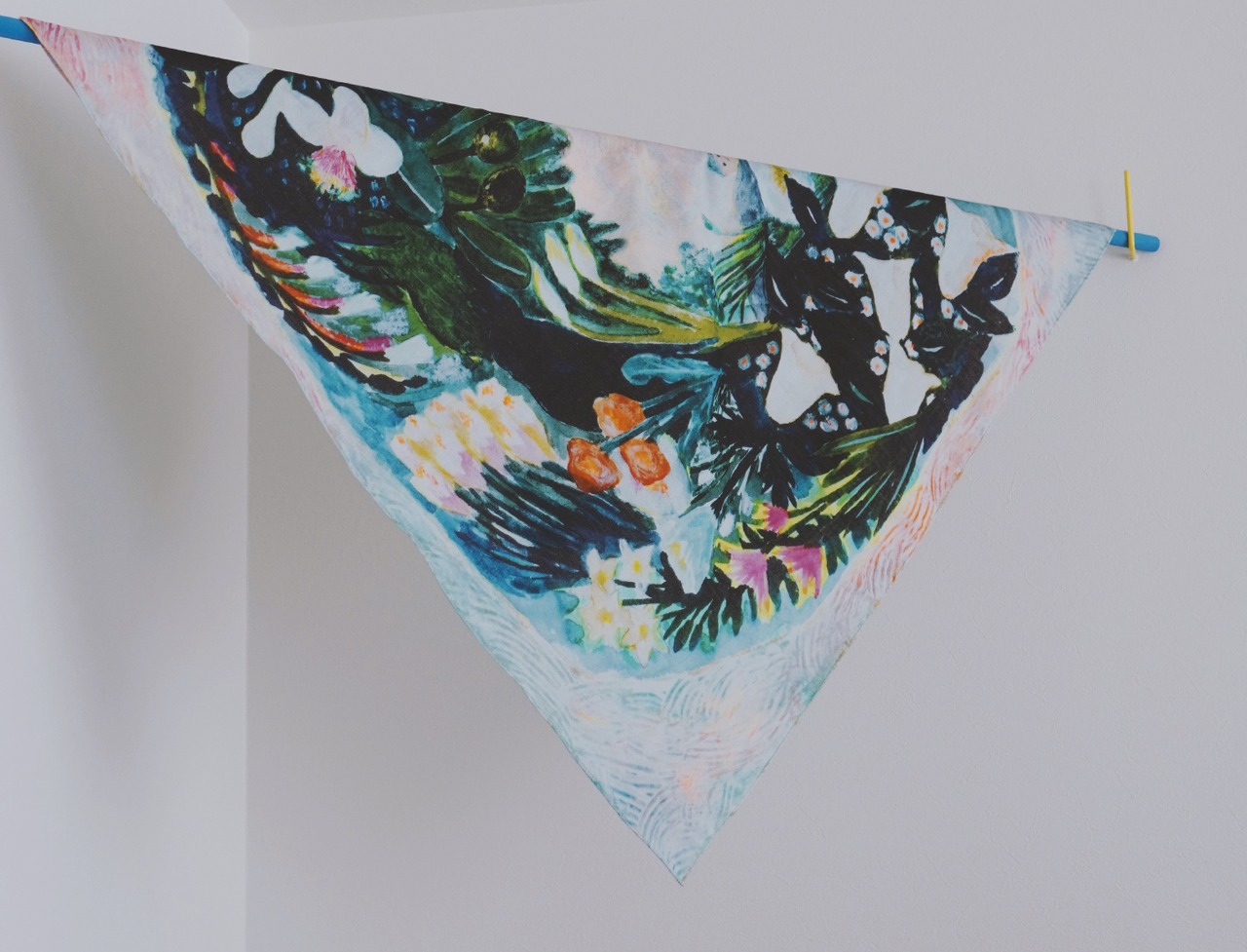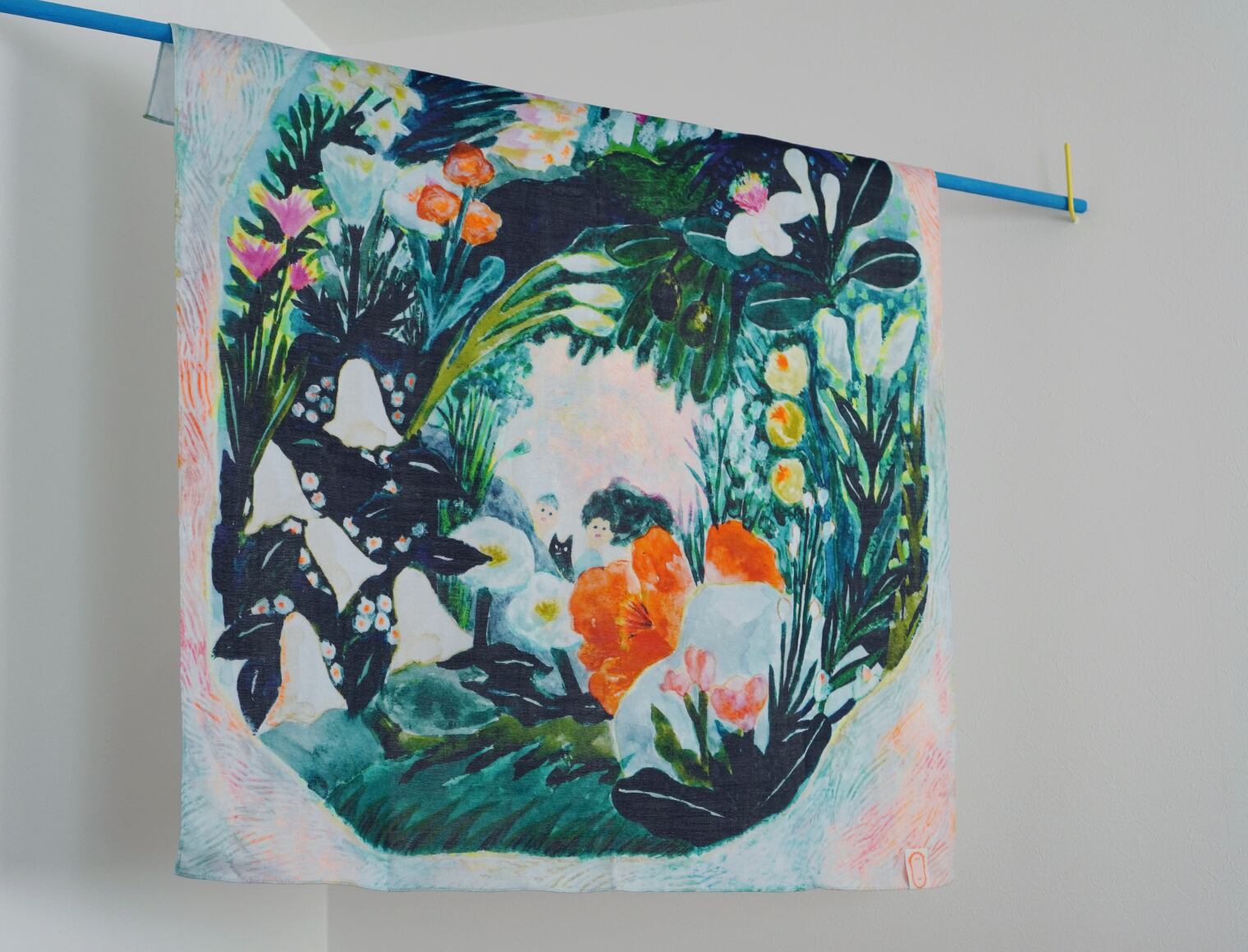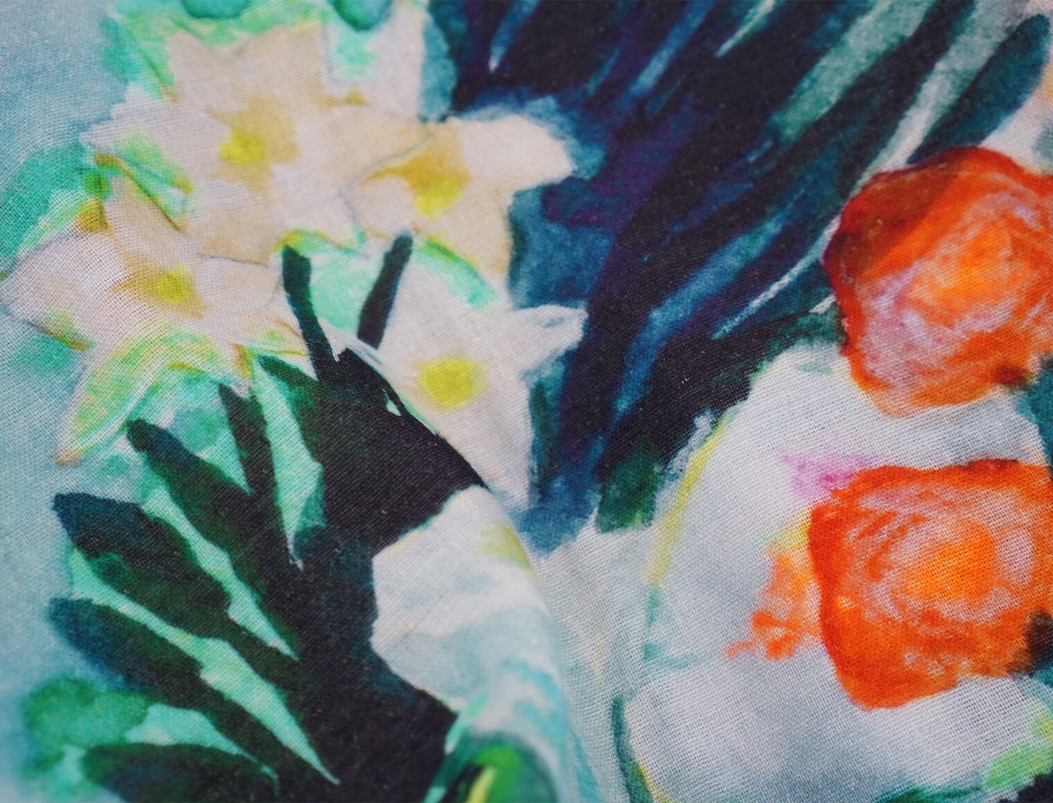 深いグリーンの中にオレンジや黄色、ピンクなどが差し色になって