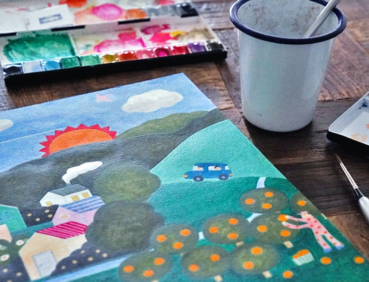 水彩やオイルパステルなどで絵を描き
